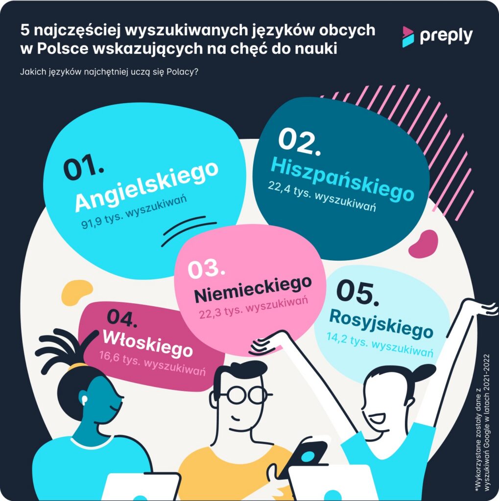 Ciekawostką jest też to, że w różnych miastach zainteresowaniem cieszą się zupełnie inne języki. Mieszkańcy Łodzi czy Warszawy chętnie decydują się na naukę języka hiszpańskiego. W Lublinie, Opolu czy Szczecinie popularniejszy jest z kolei niemiecki. Niezmiennie we wszystkich miastach Polski rodzice najchętniej wysyłają swoje pociechy na lekcje angielskiego. W 2022 roku hasła związane z nauką tego języka wyszukiwano w Google prawie 92 tysiące razy. Więcej informacji na temat wyników tego badania można znaleźć tutaj.
